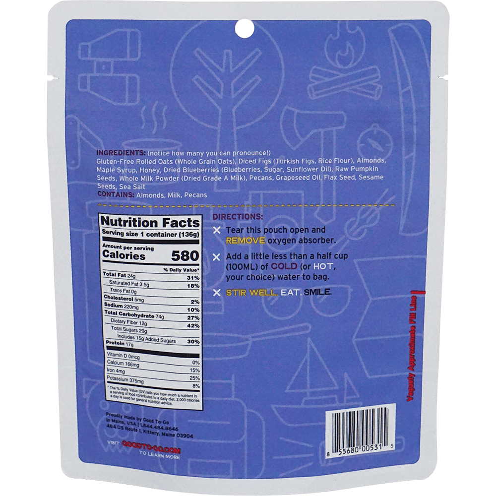 Gluten-Free Rolled Oats (Whole Grain Oats), Diced Figs (Turkish Figs, Rice Flour), Almonds, Maple Syrup, Honey, Dried Blueberries (Blueberries, Sugar), Raw Pumpkin Seeds, Whole Milk Powder (Dried Grade A Milk), Pecans, Grapeseed Oil, Flax Seed, Raw Sesame Seeds, Sea Salt